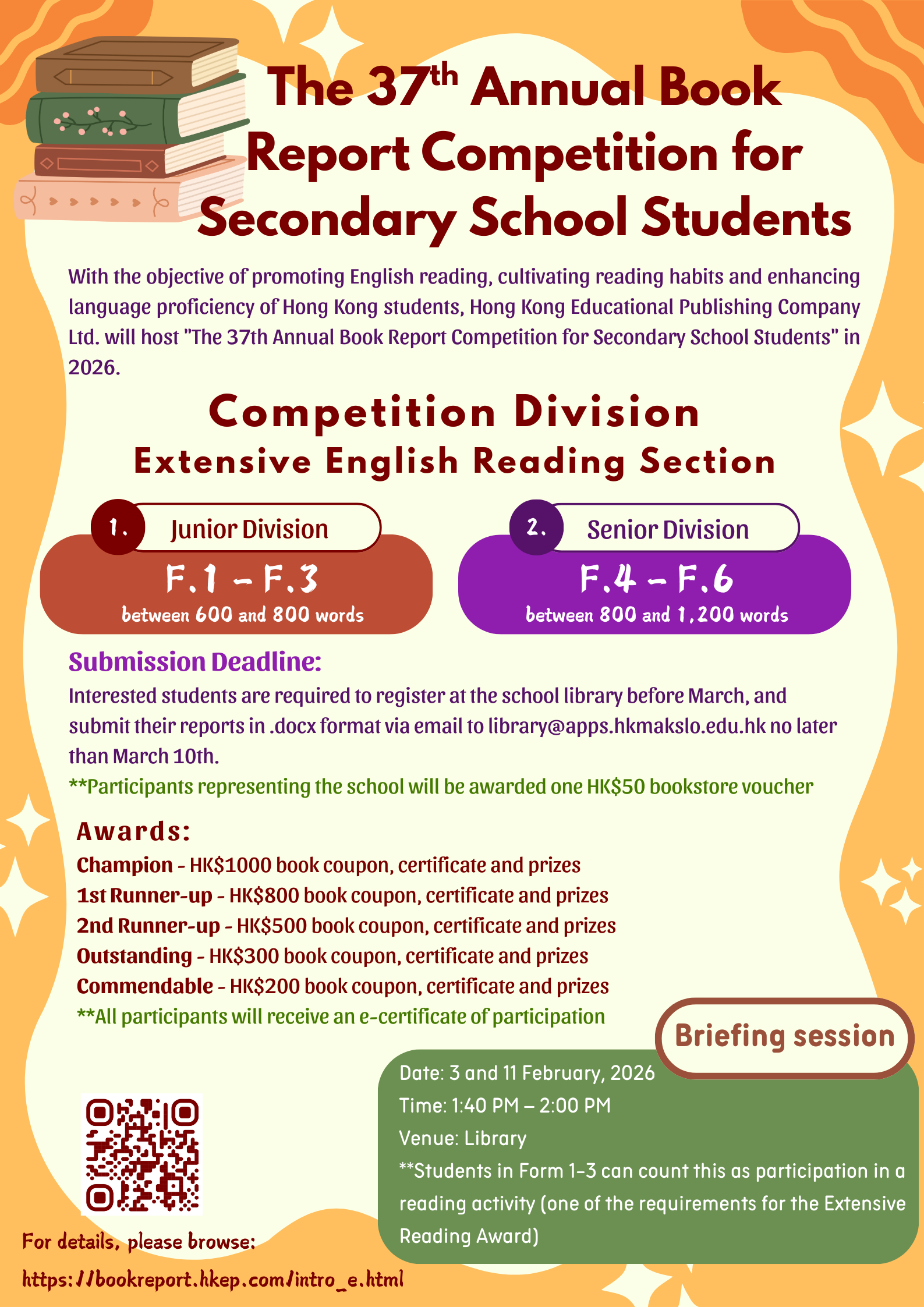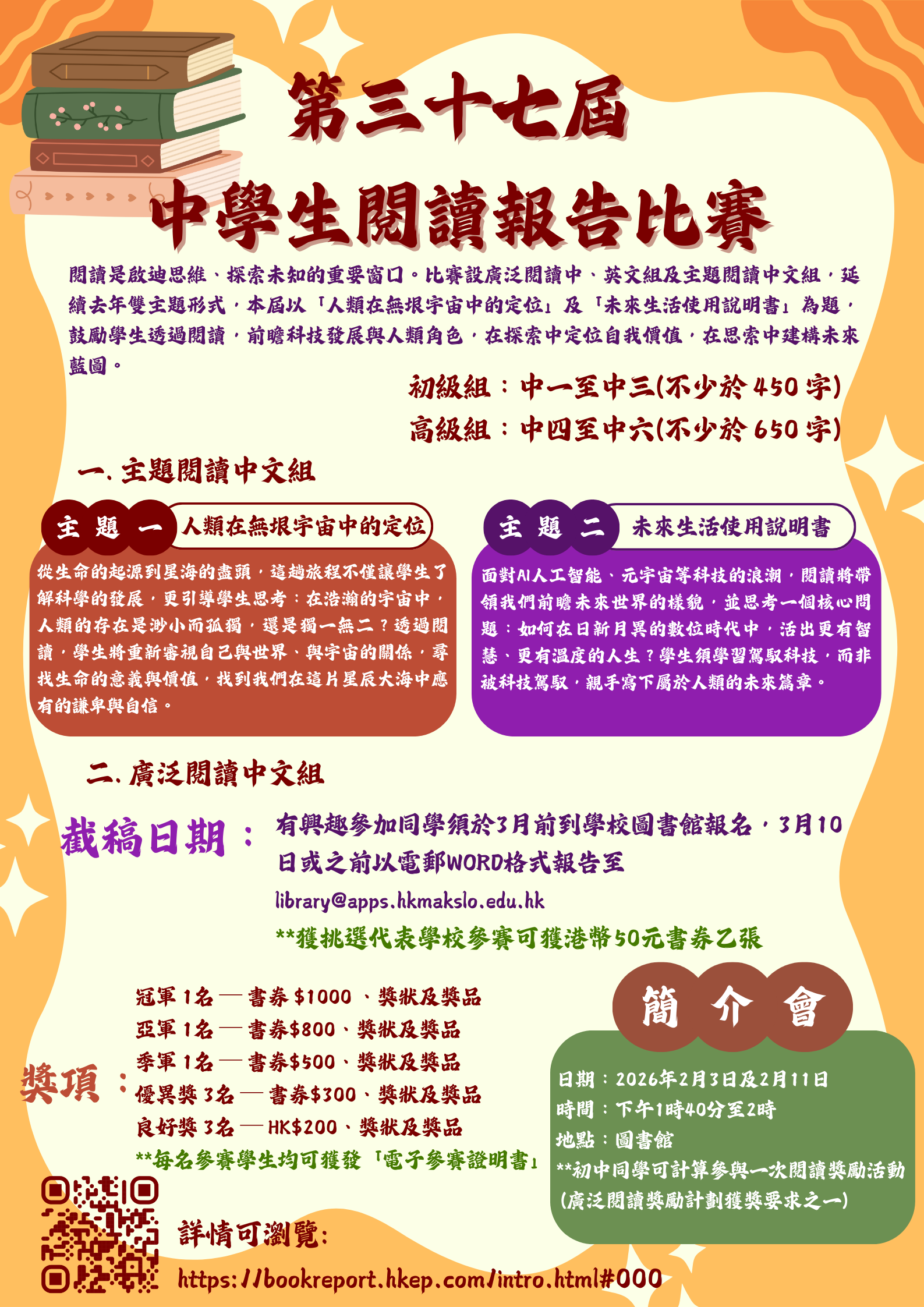 歡迎有意參加比賽的同學帶同將要做閱讀報告的圖書,出席以下日期的簡介會:2月3 日或11日(1:40-2:00)圖書館